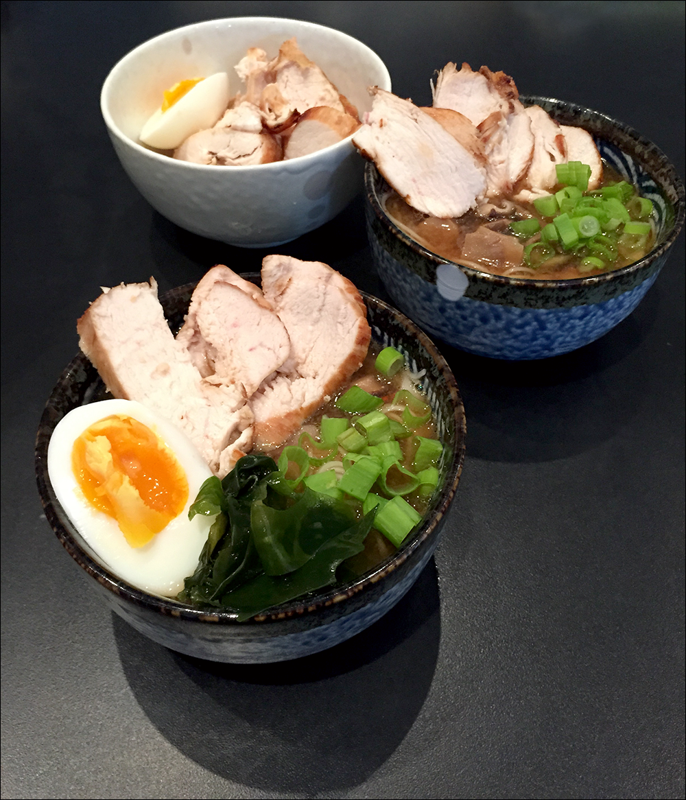 - Finally slice the big part of the chicken, cut the egg in two. In a bowl, put some noodles, add the soup and top it with an half of egg, te chicken slices, the green part of the spring onion and some seaweeds.