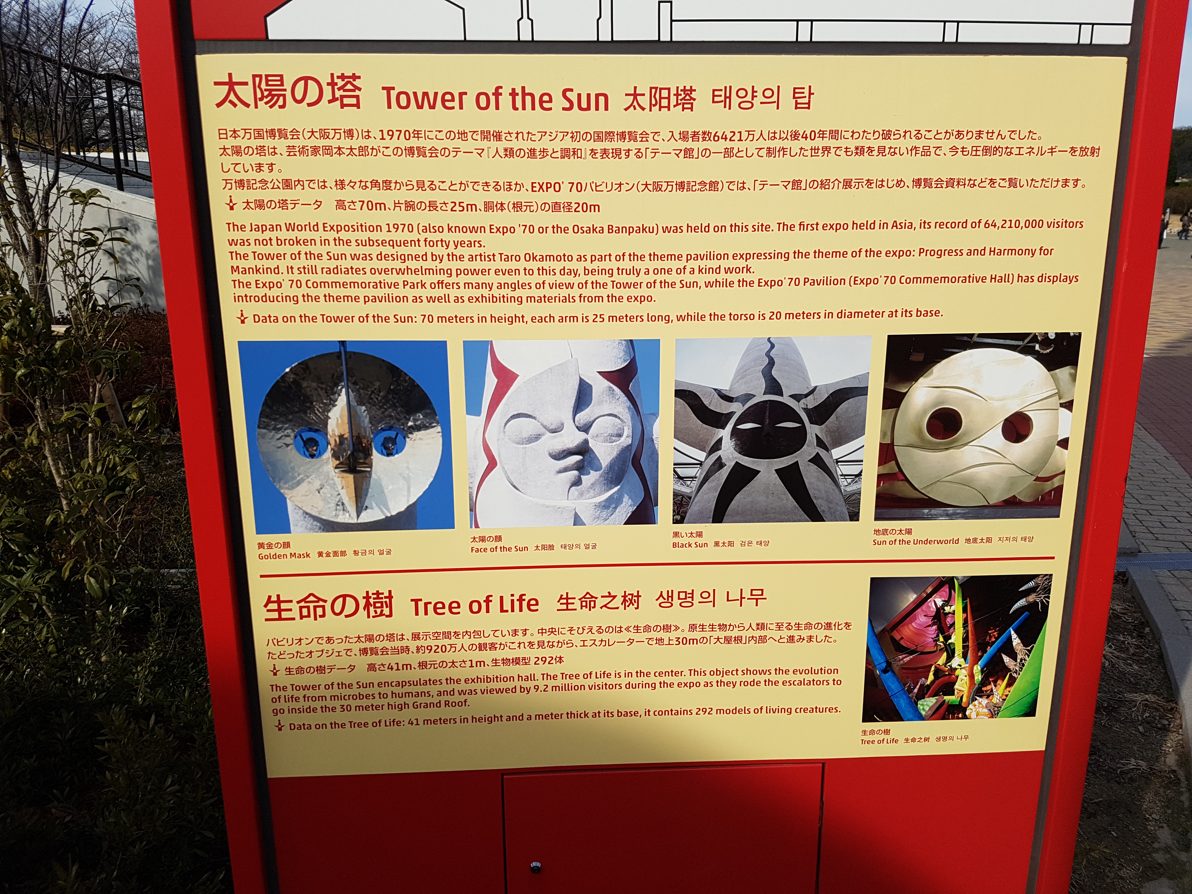 Saturday woke up ultra early again at like 4:00. I was pretty much bored during this early morning but as the day appeared nice I went around 9:00 for a walk. As I needed a mouse for my computer I decided to go to a commercial center. The closest one was at 35 minutes of walk, on the other side of — as I discovered — the park of the Japan World Exposition of 1970. That is where the strange statue is — by the way it is called the Statue of the Sun and you can read about it in the following pictures.