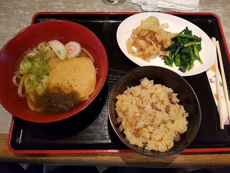 Tuesday was my first time ever having real Japanese Udon — I made my own Udon a few time but never had any in a restaurant. It was served in a pretty simple broth with green onion, a thin slice of sweet fried tofu, a narutomaki piece — and no it’s not a Maki done in reference to the Manga Naruto but a sort of fish cake — and some shredded Kombu seaweed. very lovely. With the Udon dish was a dish of fried rice with soy sauce, carrots, konjaku, shimeji mushrooms and a few pieces of chicken and of fried tofu. I reaaaaaaally loved it so will try to do it at home and share the recipe with you. Finally there were some deep-fried onions and blanched veggies — some bok choy I guess. And as always some pickled veggies, that tasted awesome with the deep-fried onions.