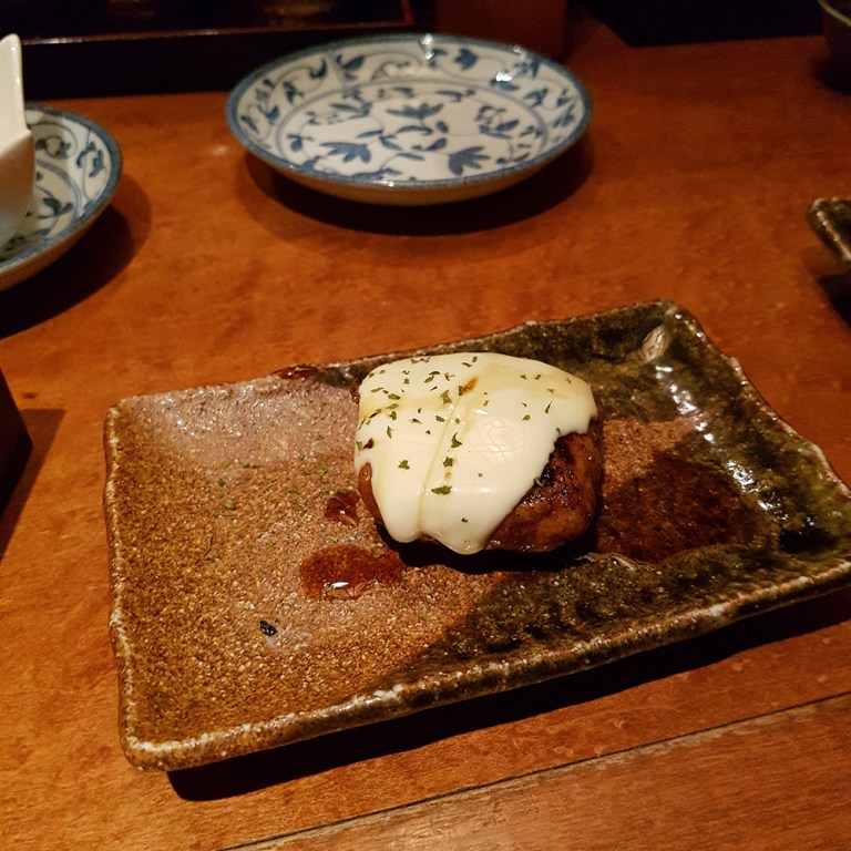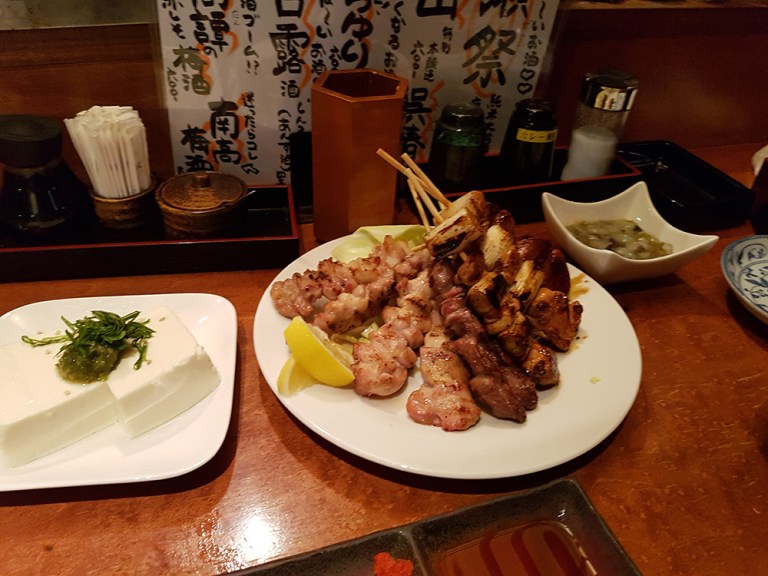 Then the plate of Yakitori arrived. So I guess it was 4 of simple chicken, 2 traditional scallion and chicken, 2 chicken hearts one and 2 of some other chicken organ. Everything was delicious. On the left of the picture you can also see some tofu with wasabi and sliced perilla leaf.