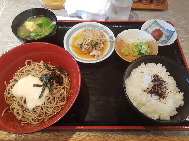 And for lunch it was cold Soba noodles topped with Nori seaweeds and I guess grated daikon. Additionally you can add some green onions and wasabi — which I did — for more flavors. I really liked it. And as side dish, that stir-fried veggies I like and some rice topped with powdered pickled plums. I need to find this powder cause it so nice on rice. For dinner simply had some grilled fish on rice.