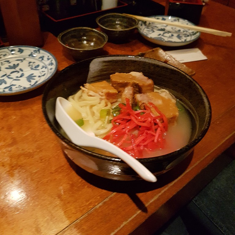 And my colleague explained me that this Yakitori restaurant does also Okinawa — that the Japanese tropical island — style food. So we shared some Okinawa style udon with pork and pink ginger. I really loved that restaurant and Yakitoris in general.