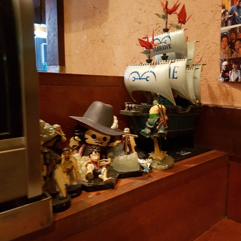 So I arrived at Ibaraki-shi station a little bit early and waited there, but nobody was arriving. I started thinking that perhaps I misunderstood something and as I don’t have a Japanese phone number I was a little bit worried. But a colleague of mine arrived soon after and explained me that it will be only us as everybody else is still hungover from Friday’s party. So we tried to go to the best Yakitori restaurant/bar of the area but it was fully booked — next time we will reserve >.< — and walked around and got to another Yakitori restaurant: とりのねぐら 阪急茨木店. It was a very lively restaurant with a lot of figurines around the shop. We got places at the bar in front of a collection of One Piece figurines.