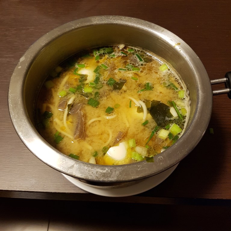 For dinner I decided to make some Udon in a miso soup, with Konjaku, green onions, Wakame seaweeds, eggs and sesame oil. But I made way too much — like 1L of soup — and didn’t have any proper bowl to eat it, soooo … Simply ate it straight out of the pot =D Soooo good!