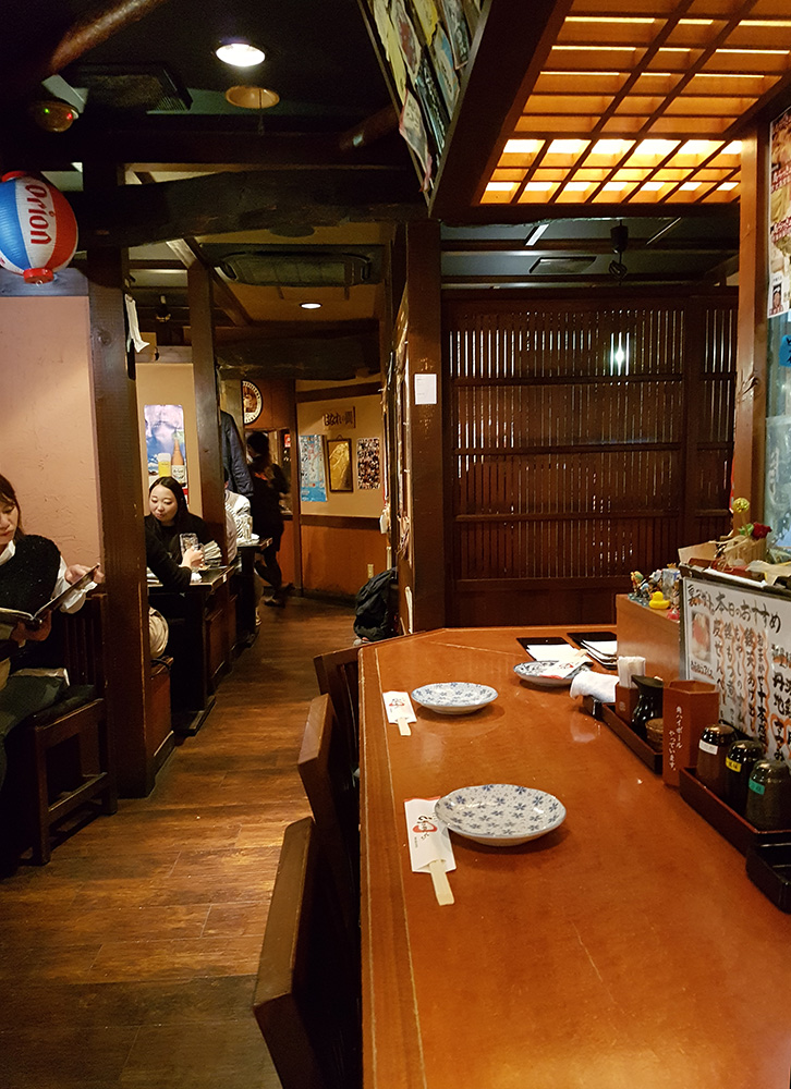 So I arrived at Ibaraki-shi station a little bit early and waited there, but nobody was arriving. I started thinking that perhaps I misunderstood something and as I don’t have a Japanese phone number I was a little bit worried. But a colleague of mine arrived soon after and explained me that it will be only us as everybody else is still hungover from Friday’s party. So we tried to go to the best Yakitori restaurant/bar of the area but it was fully booked — next time we will reserve >.< — and walked around and got to another Yakitori restaurant: とりのねぐら 阪急茨木店. It was a very lively restaurant with a lot of figurines around the shop. We got places at the bar in front of a collection of One Piece figurines.