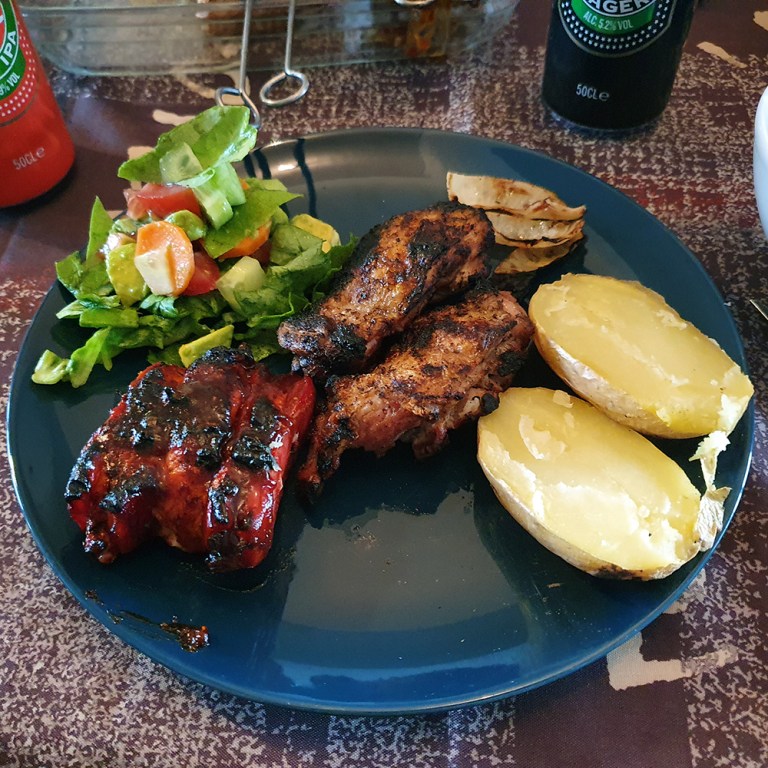 Chicken Shashlyk (in the middle), baked potato, grilled onion, salad and barbecue chicken (bottom left)