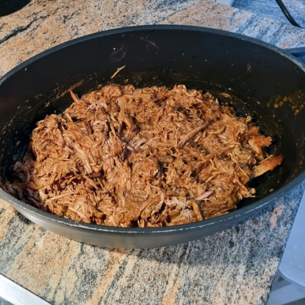 This recipe uses similar ingredients as “Char Sui”, except the red food coloring, but applying it to pulled pork instead of a roast.